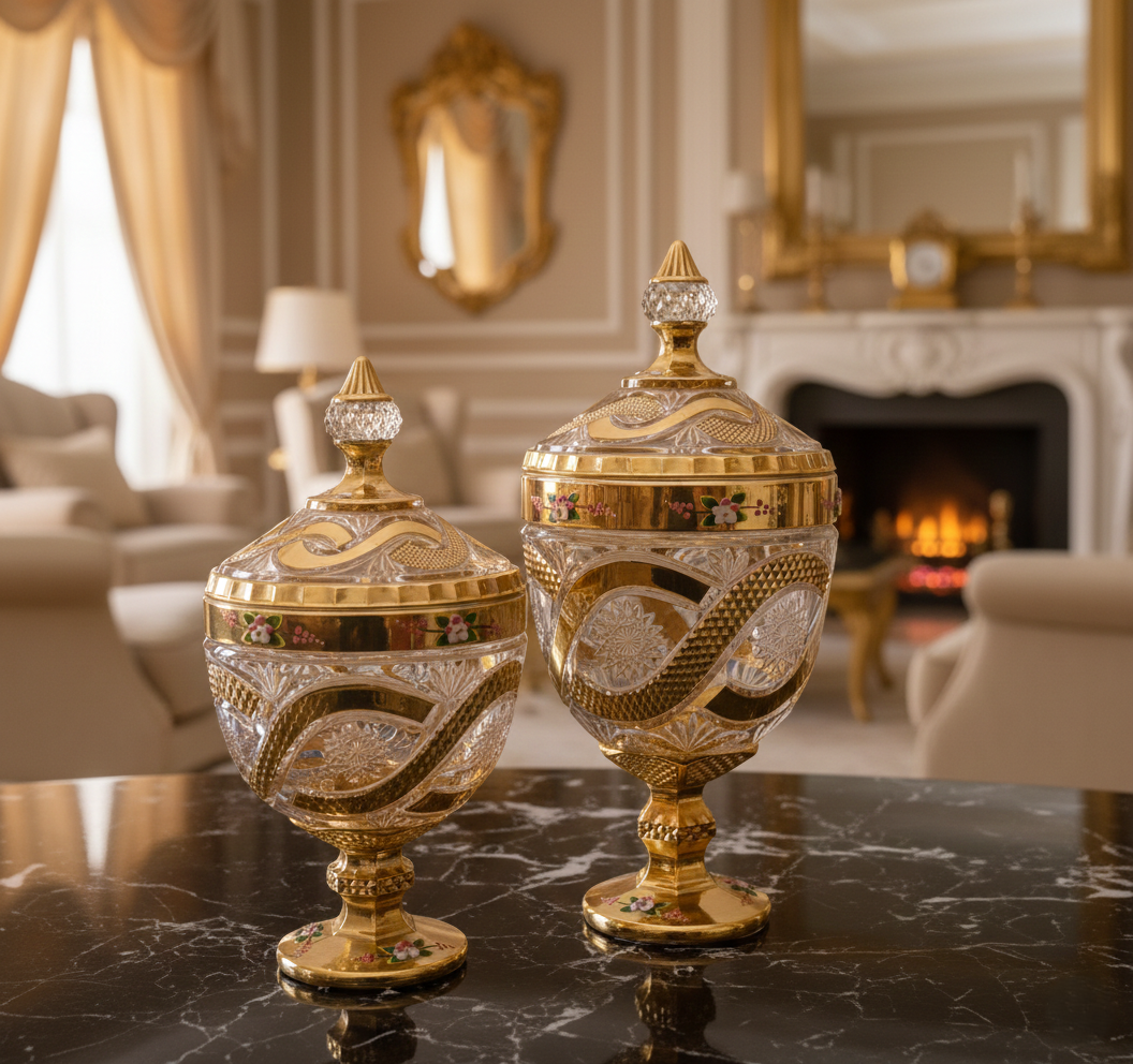 Luxury Crystal Glass Decorative Jar Set with Gold Detailing – Premium Table & Home Décor